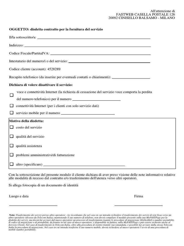 Lettera disdetta linea fissa tim